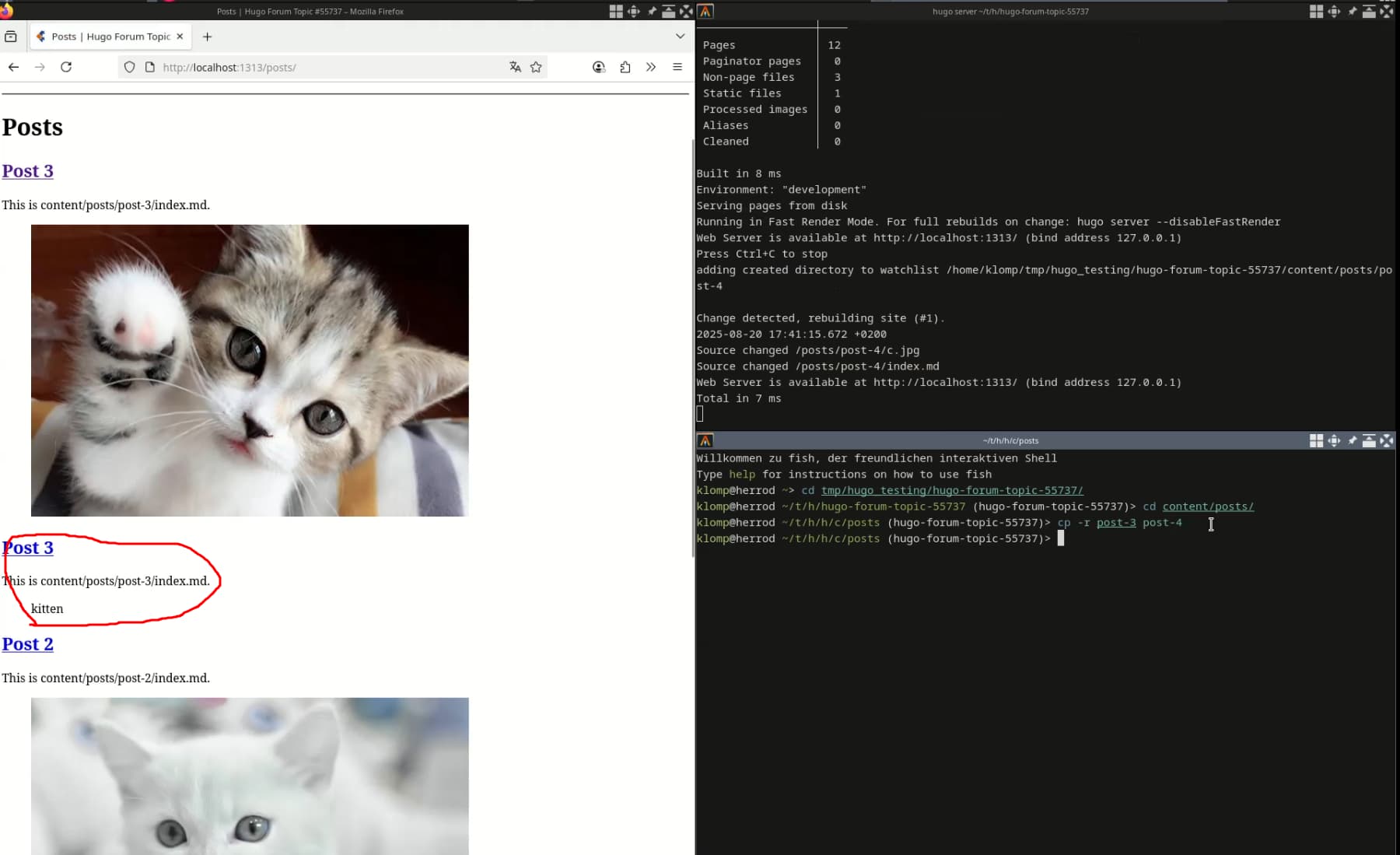 However, when I run hugo server or hugo -w and add a new post as page bundle, hugo complains that the image does not exist (.Page.Resources.Get ($u.Path) is NIL).